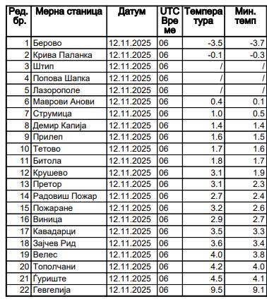 На табелата можете да ги видите температурите измерени денес наутро по градови и места во нашата Македонија и тоа на мерните станици на УХМР. Се работи за најниски минимални температури измерени денес наутро до 7 часот.