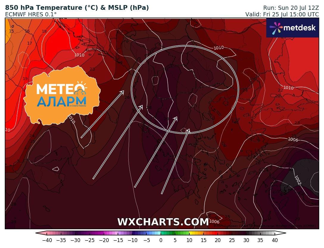 Територијата на нашата Република Македонија од денес (21 јули понеделник) па се до петок (25 јули) ќе биде под влијание на екстремно топол воздушен бран од југ, односно од Африка и истиот ќе услови екстремно високи температури на воздухот. Времето ќе биде сончево и екстремно топло со појава на мала локална облачност, а повремено ќе засилува и фенски ветер од западен и од југозападен правец.