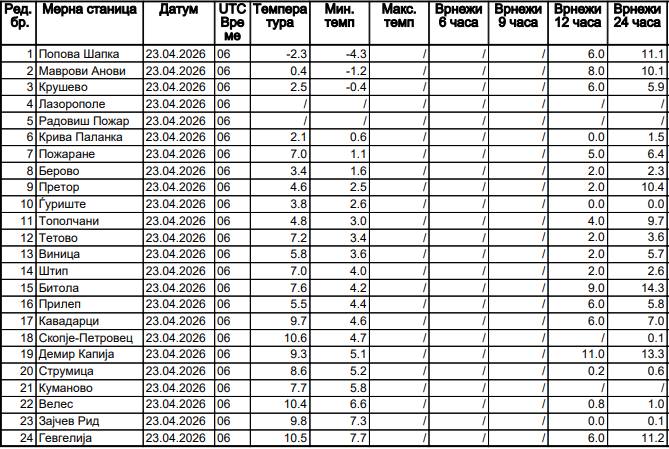 Денешното утро во Македонија 23 април 2026 четврток во Македонија ни донесе намалување на облачноста  и разведрување во најголем дел од Македонија и а врнежите насекаде престанаа. Најладно ова утро до 8 часот беше на Попова Шапка каде температурата се спушти на -4 степени.