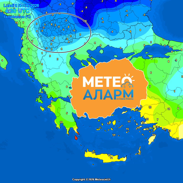 Денешното утро во Македонија понеделник 2 февруари 2026 во Македонија е ладно и претежно облачно а локално провејува слаб снег особено во повисоките населени места и на планините. Температурите ова утро на повеќе места во Македонија се за неколку степени под нулата.