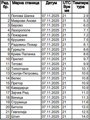 На табелата можете да ги видите температурите измерени по градови и места во нашата Македонија до 22 часот вечерва и тоа на мерните станици на УХМР.