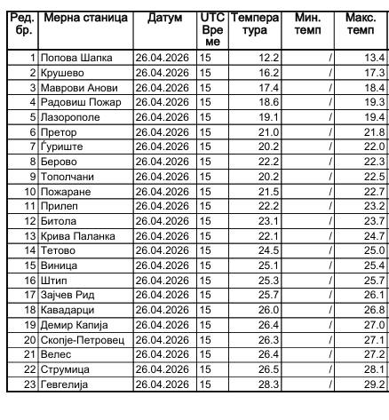 Денешниот ден 26 април 2026 недела во Македонија ни донесе претежно сончево и значително потопло време а повремено особено во Повардарието  и во источните предели дуваше  засилен ветер од северен правец. Најтопло до 17 часот попладнево беше  во  Гевгелија  со измерена макссимална температура од  29  степени.
