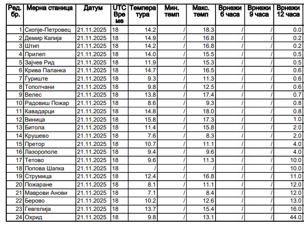 На табелата можете да ги видите денешните температури и количеството на врнежи во литри на метар квадратен измерени по градови и места во нашата Македонија до 19 часот вечерва и тоа на мерните станици на УХМР.