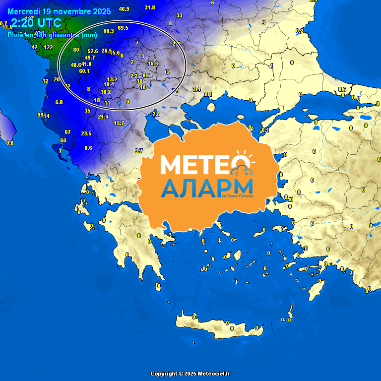 Територијата на нашата Република Македонија се наоѓа под влијание на силен циклонски систем кој се формираше над Џенова и истиот условува да имам обилни врнежи од дожд и истите се најобилни во западните предели каде се проследени со појава на грмежи и силен јужен ветер, локално овие процеси се застапени во форма на невреме.
