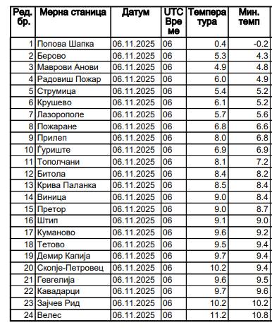 На табелата можете да ги видите температурите измерени ова утро по градови и места во нашата Македонија до 7 часот и тоа на мерните станици на УХМР. Да напоменам дека се работи за измерени минимални утрински температури на воздухот за денес.