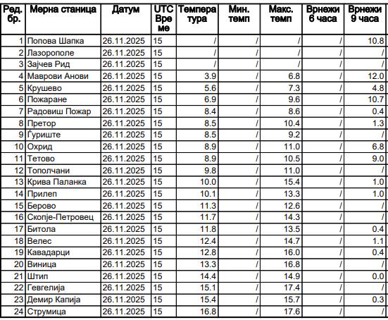На табелата можете да ги видите денешните максимални температури измерени попладнево до 16 часот по градови и места во нашата Македонија и тоа на мерните станици на УХМР.