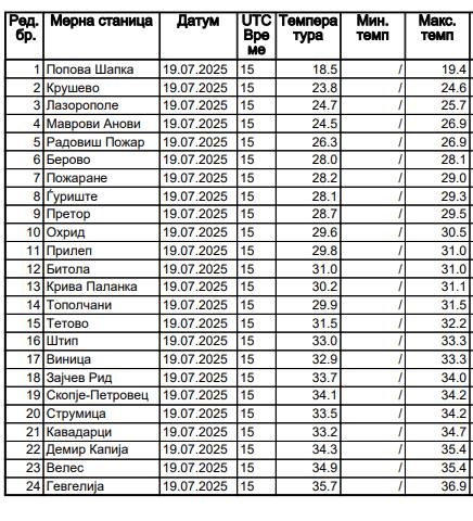На табелата можете да ги видите денешните максимални дневни температури измерени во нашата Македонија по градови и места, и тоа на мерните станици на УХМР.