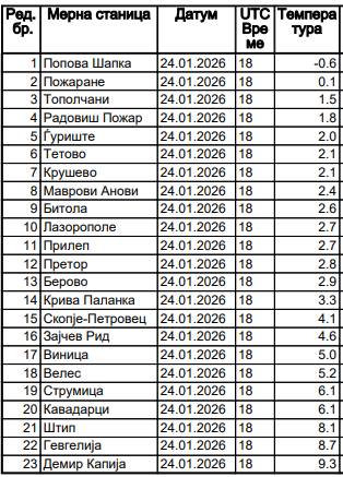 На табелата можете да ги видите температурите измерени по градови и места во Македонија вечерва до 19 часот и тоа на мерните станици на УХМР.