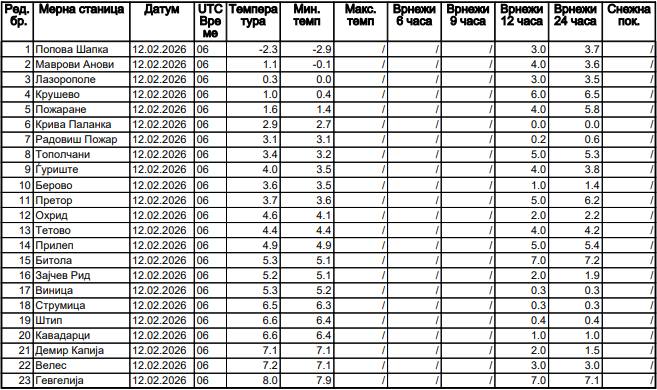 Во изминатите 24 часа исто така во Македонија на повеќе места имаше повремени врнежи од дожд а на повисоките планини со надморска височина од над 1400/1500 метри имаше врнежи од снег па така снежната покривка на Попова Шапка се зголеми и изнесува над 60 сантиметри. На табелата која ја објави УХМР може да ги видиме температурите измерени ова утро до 7 часот по градови и места во Македонија како и наврнатото количество на воден талог во литри на метар квадратен во изминатите 24 часа исто така до 7 часот утрово.